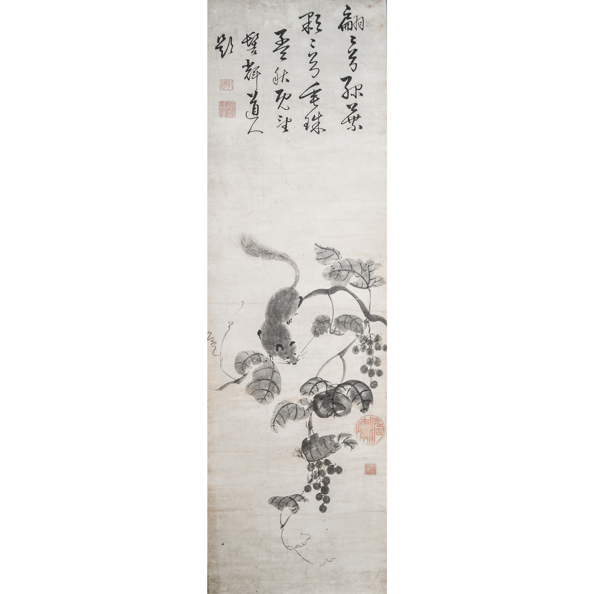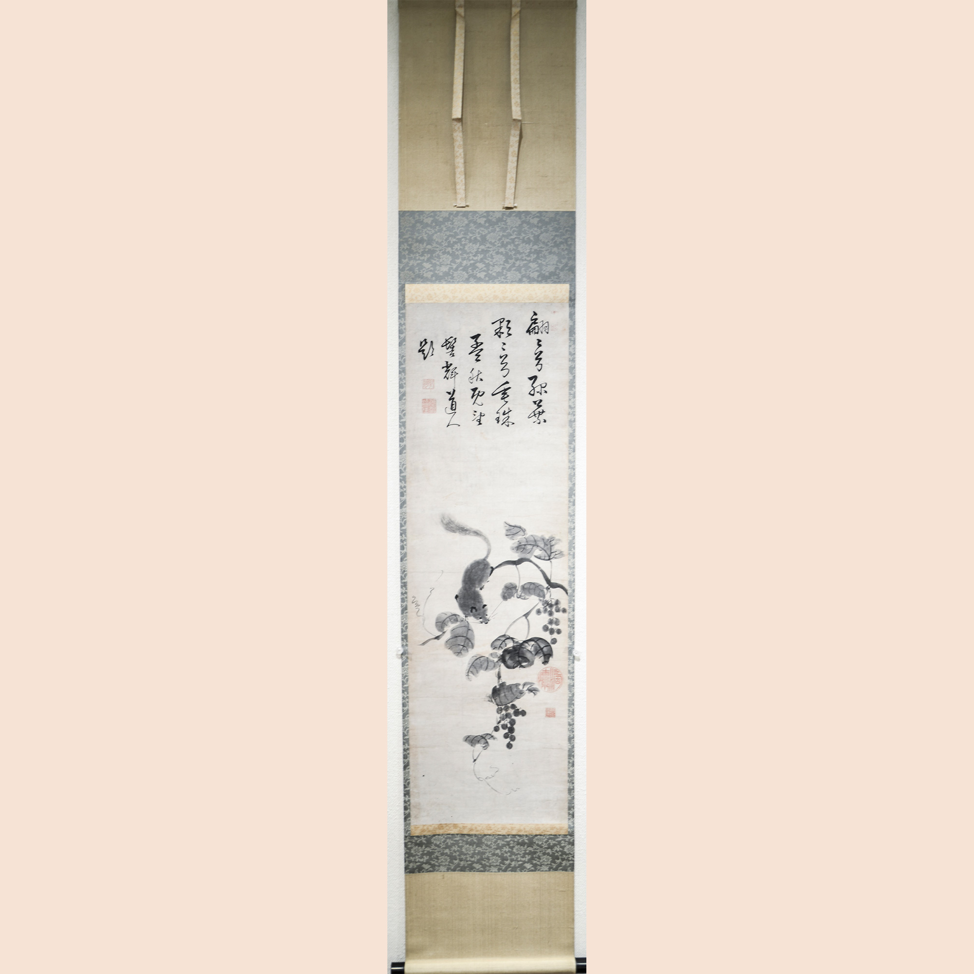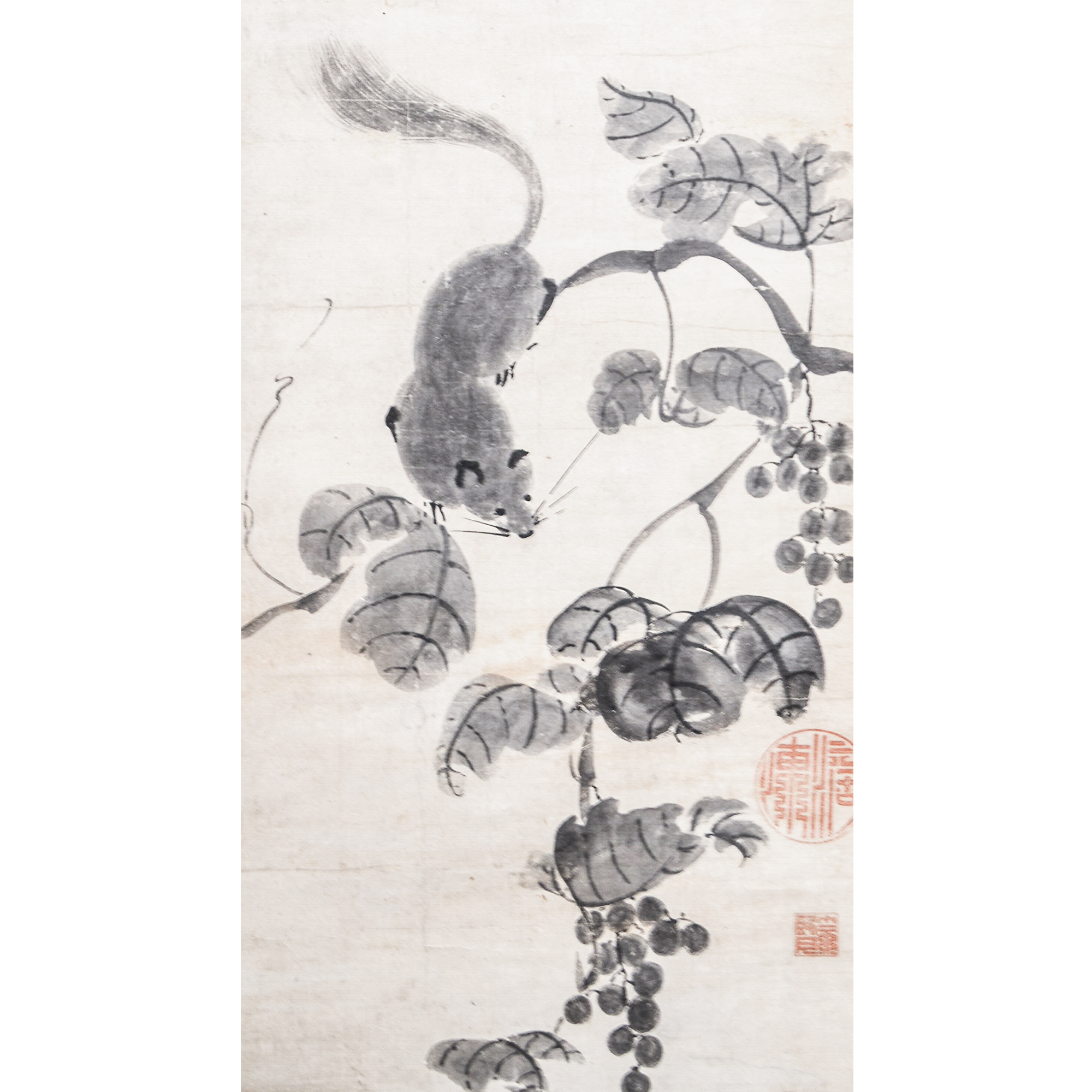 In this work, the squirrels and grapes are rendered in a lively manner using the mokkotsu (boneless) technique, without defining contour lines. An inscription appears in the upper portion of the composition by the Ōbaku monk Dōshū Etsuzan.