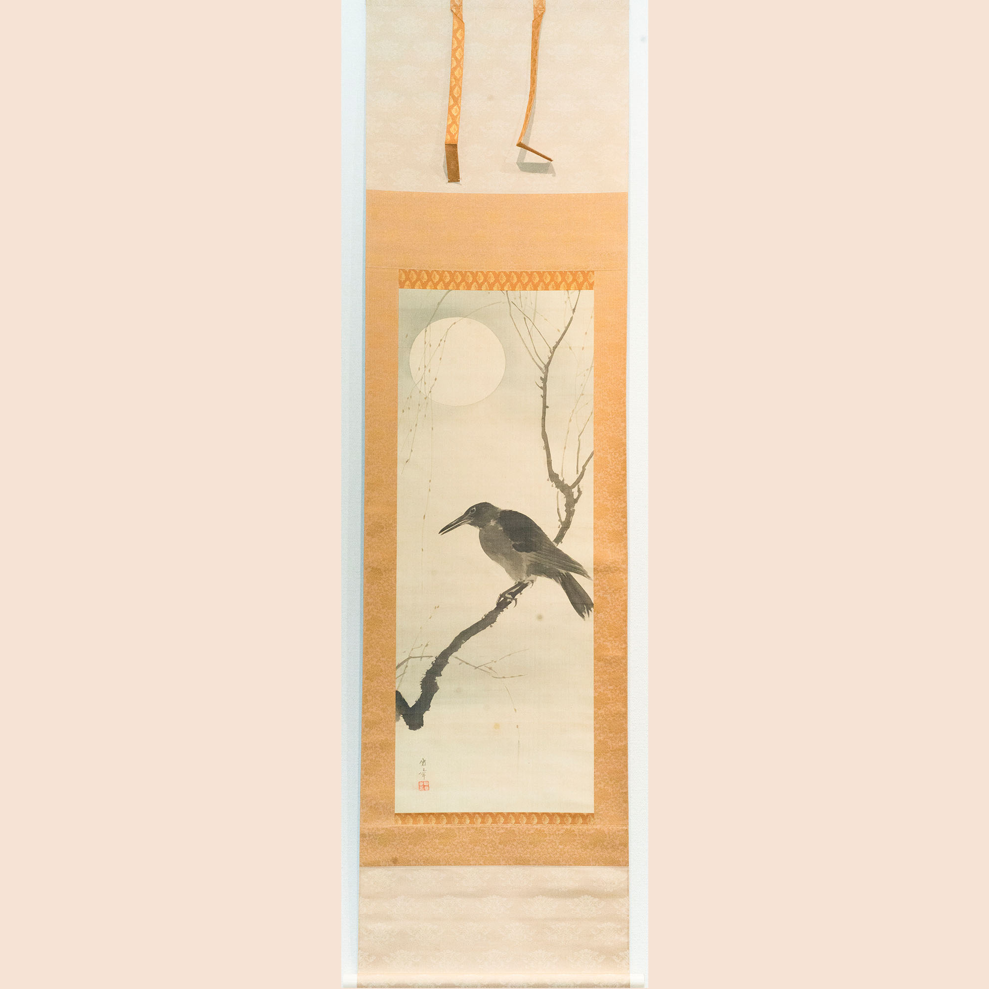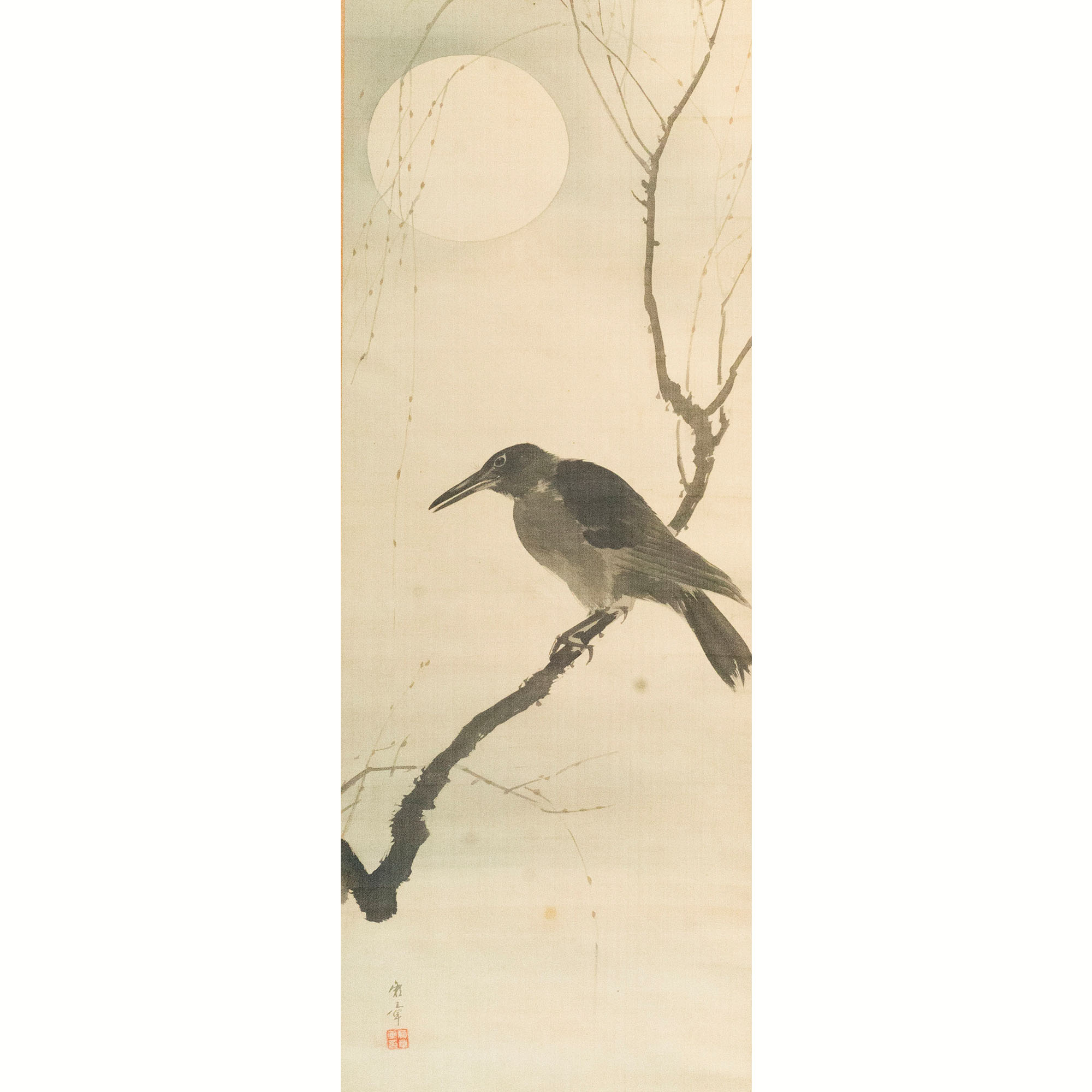 The bird is modeled through layered applications of ink, creating gradations of dark and light that give it a sense of volume. Above, the moon is expressed through the sotoguma technique, left white and encircled by a subtle halo of ink.